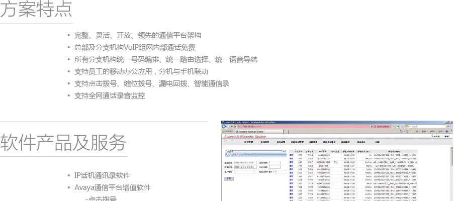 奧誠信息企業通信解決方案基于Avaya通信平台,提供先進的統一通信與聯絡中心解決方案。開發出的一系列通信增值應用軟件(jiàn)可(kě)以通過一個可(kě)靠性和适應性的平台,支持多種新的協作(zuò)功能、應用和客戶服務。還(hái)能依靠強大(dà)的擴展能力和靈活性,支持從(cóng)小型分(fēn)支機(jī)構到公司總部、從(cóng)企業通訊到複雜聯絡中心系統。随着企業需求的變化和業務的成長,能夠持續地擴充相(xiàng)應的通信功能。