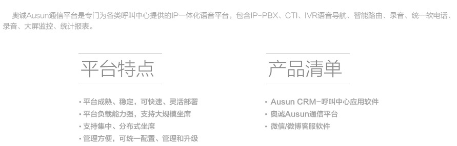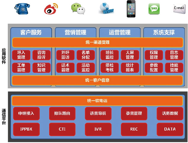 在互聯網+及移動互聯網和社交媒體(tǐ)豐富的大(dà)背景下,企業溝通渠道與手段也日(rì)趨多樣化,奧誠全媒體(tǐ)聯絡中心解決方案就(jiù)是把現有的接入渠道整合起來(lái),從(cóng)單一的語音接入向全媒體(tǐ)接入轉變,發展到以電話(huà)、短(duǎn)信、傳真、E-mail、視頻、WebChat、微信、微博等多種渠道爲一體(tǐ)的“客戶聯絡服務中心”。解決方案包含呼叫中心應用軟件(jiàn)和Ausun通信平台兩部分(fēn)。成熟、穩定的通信平台和輕松易用的應用軟件(jiàn)可(kě)以滿足各個行業的客戶服務與營銷服務需求。